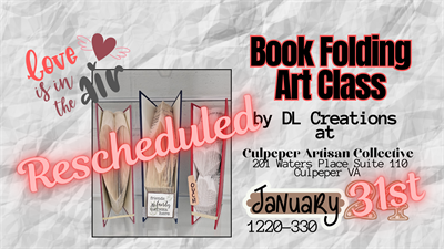 RESCHEDULED FROM 1/24 TO 1/31 DUE TO SNOW. You've seen them! You love them! Now you can learn how to create your own! January 24th from 12:30 to 3:30 PM Debbie of DL Creations will teach you how to create your own book folded art. You choose your design! Choose your design: Vertical Hearts Home w/ Heart Heart You'll make your selection when you register at www.dlcreations540.com ??Hosted by Culpeper Artisan Collective at PeaPod Atelier 201 Waters Place Suite 110 Culpeper, VA 22701