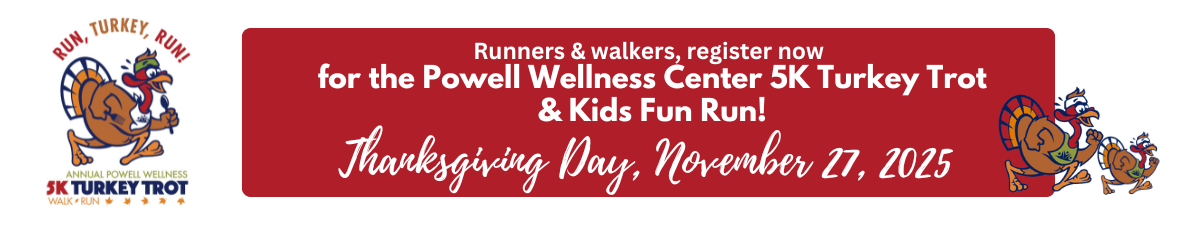 Runners and walkers of all ages are invited to kick off their Thanksgiving Day in a healthy way at the 8th annual Powell Wellness Center 5K Turkey Trot! Race start time 8:00 am, Kids Fun Run, 9:15 am. Race registrations support medical fitness scholarships for adult and youth community members in need who want to improve their health through a regular program of exercise.